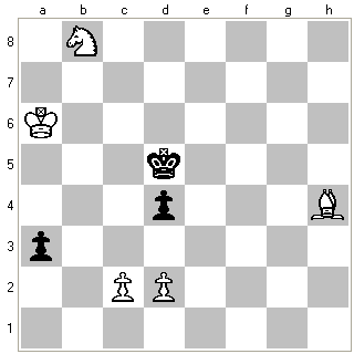 1. ..., a2 2. Hb4+ és az a-gyalog elveszett, de a 1. ..., Kc5 2. Fe7+ folytatás is ugyanazt eredményezi.